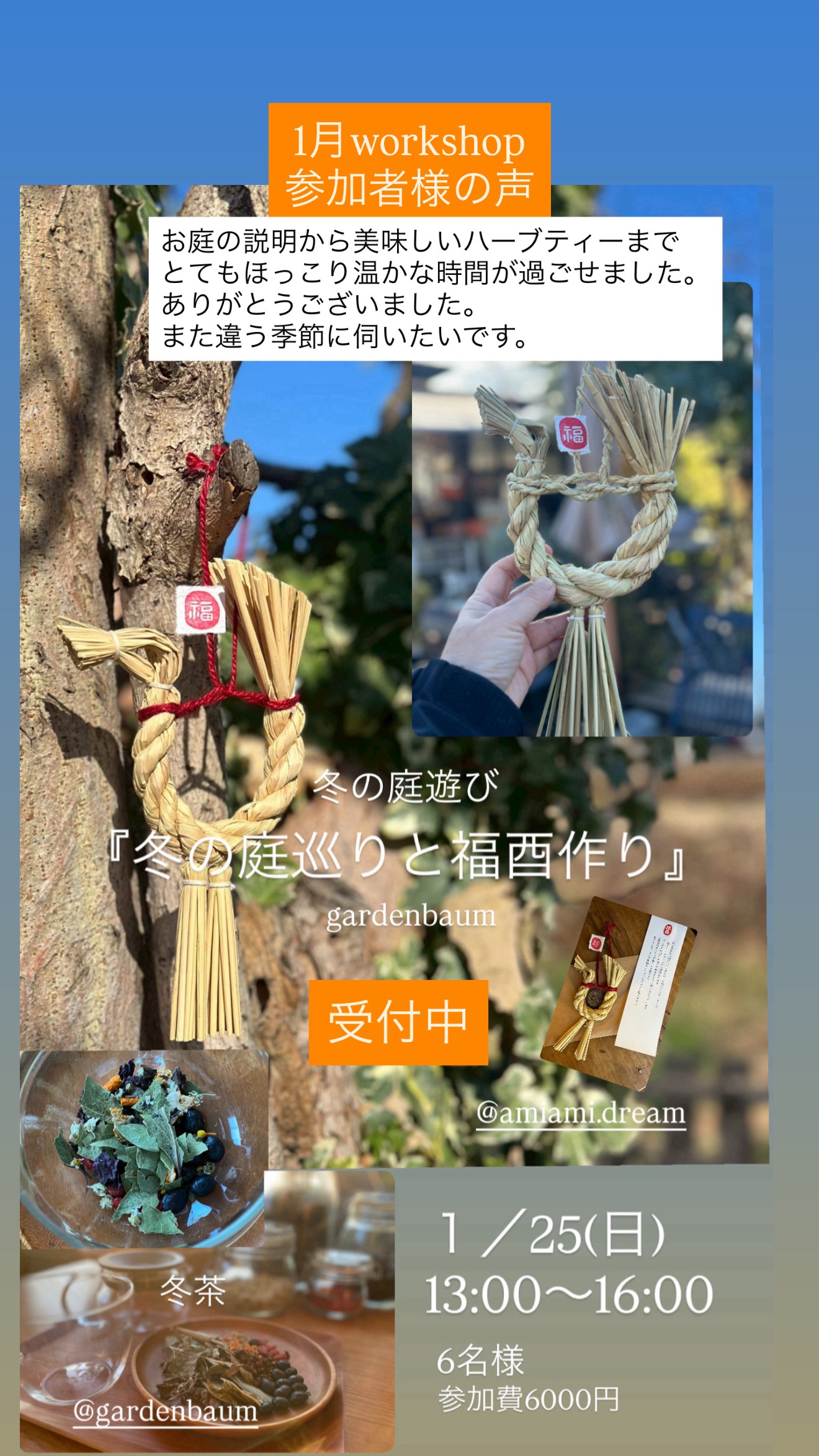 冬の庭巡りと薬草茶と福酉 ブログ 2026.01.22 (福酉の由来)もともとは、高千穂地方で祝酉という縁起物として飾られていました。酉は昔から「神使い」と言われて大切にされて来ました。福をトリ込む という意味合いからたくさんの「福」が飛んで来ますように願いを込めています。オススメは一年中飾られる縁起物とされています。商売繁盛や幸運を願う象徴としてお店や家の入り口などに飾ります。ご自分の手で作る事によって、更に思いが籠った福酉になる事は間違いありません!